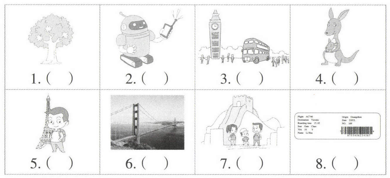 二、听句子三次,选出相应的图,把其大写字母编号写在相应的括号内。(8分)