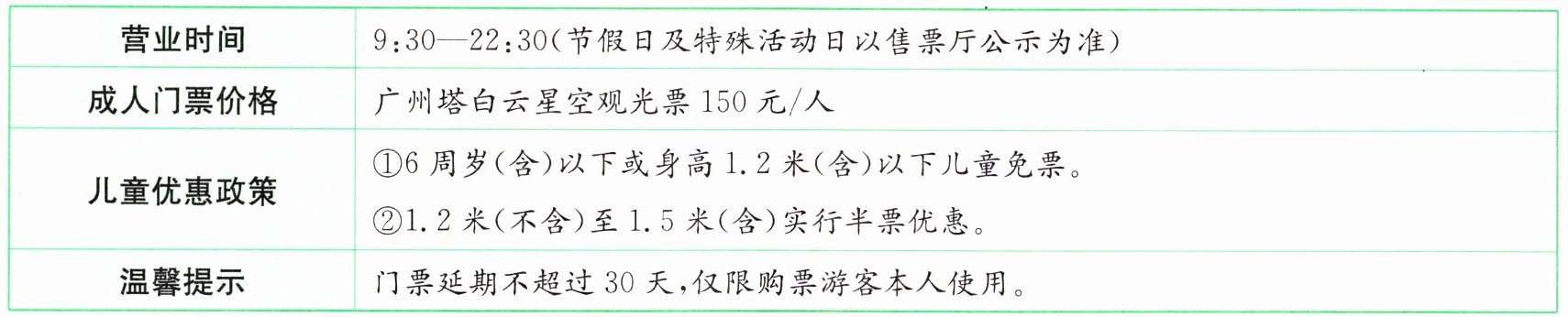 * 摩天轮:位于广州塔约460米处,由16个观光球舱组成,运行一周约为20分钟,游客可从各个角度观赏广州市容。