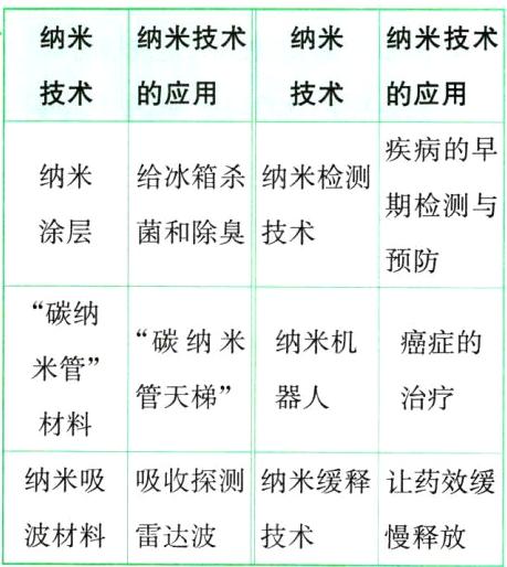 四、思维题 课文介绍了纳米技术在哪些领域的应用?请根据提示完成表格。(目标:203)