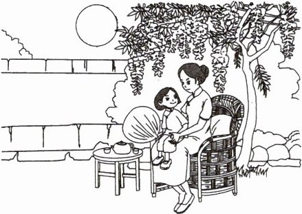 2. 观察右图,想象画面:月明星稀的夜晚,在园中的 _____下,“我”坐在母亲的_____上,母亲给“我” ______。从中我能体会到童年的 _____和母亲的 ______。