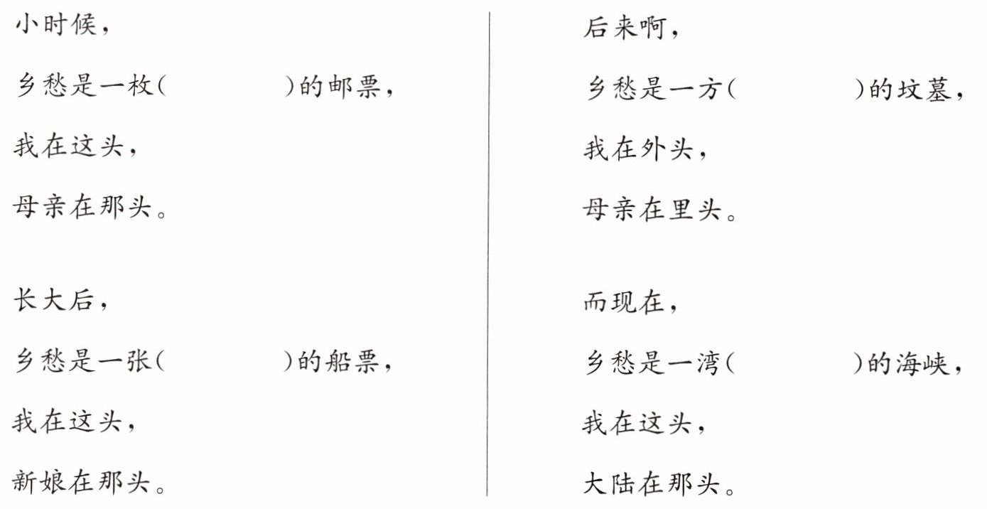 2. 乡愁是一种抽象的情感,诗人把它分别比作_______、_______、_______、_______,表达出了______________________之情。