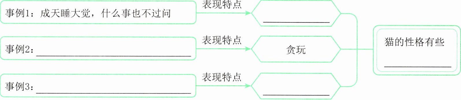 2. 文段写了哪些事例来表现猫的性格特点?填一填。