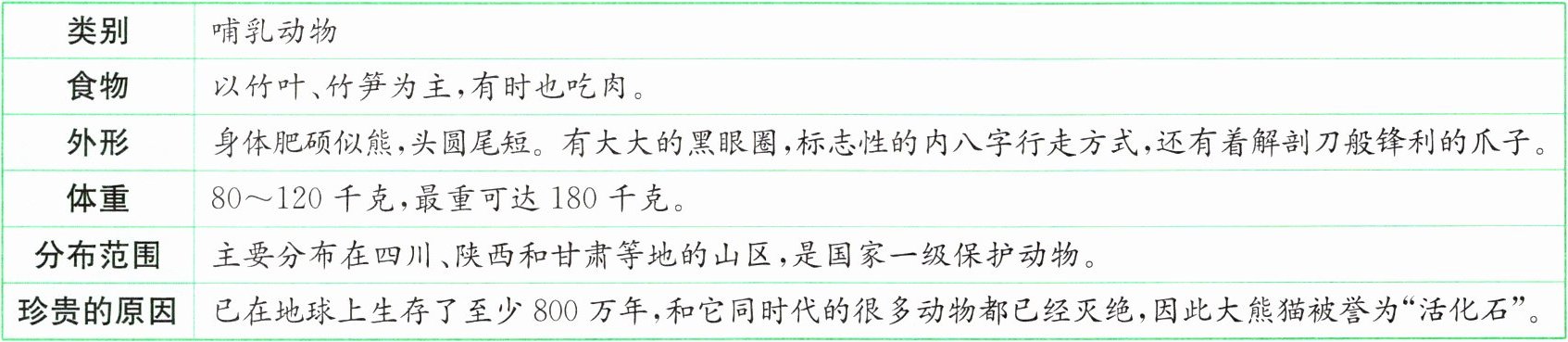 1. 大熊猫已在地球上生存了至少_______年,被誉为“_______”。大熊猫最重可达_______千克。