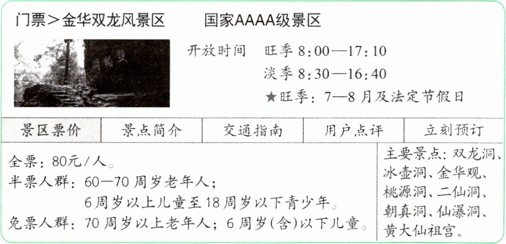 七、实践题 壮壮一家暑假去金华双龙风景区旅游,预订门票时看到下面网页,请据此完成练习。