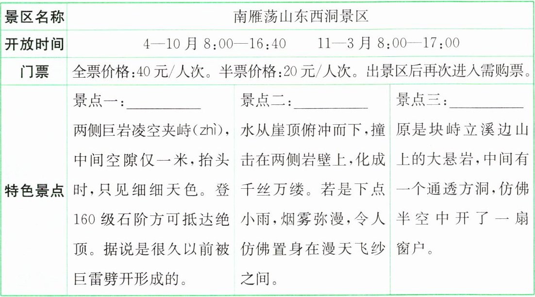 (2)南雁荡山东西洞景区只有一线天、梅雨瀑、石天窗三个景点。 ( )