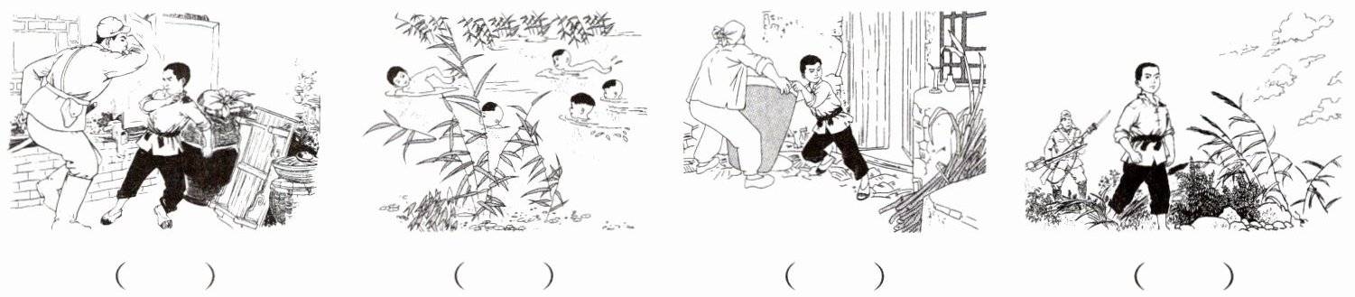 3. 班里准备排演课本剧《小英雄雨来》,并找了几张图片来做宣传海报,请你按时间顺序排序,并完成练习。