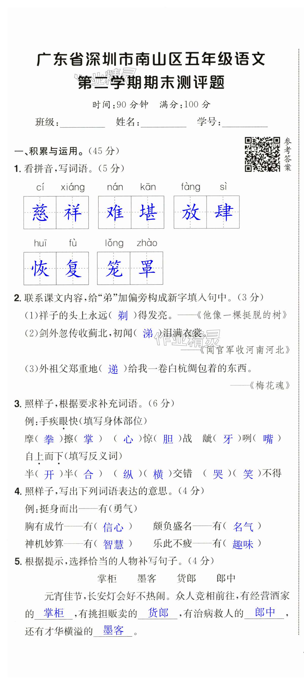 注:目前有些书本章节名称可能整理的还不是很完善,但都是按照顺序排列的,请同学们按照顺序仔细查找。练习册 2025年黄冈小状元作业本五年级语文下册人教版广东专版 答案主要是用来给同学们做完题方便对答案用的,请勿直接抄袭。