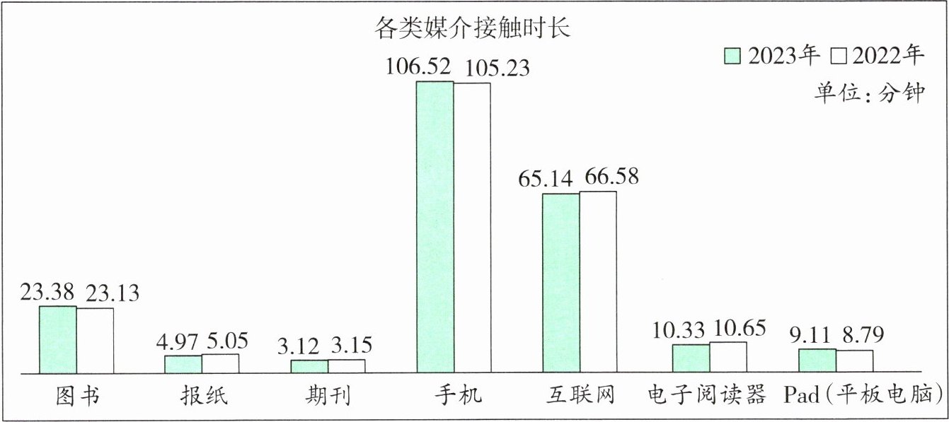 【材料一】2024年4月23日上午,在第三届全民阅读大会上,中国新闻出版研究院发布了第二十一次全国国民阅读调查结果。其中,2023年与2022年成年国民人均每天各类媒介接触时长的数据如下图所示。