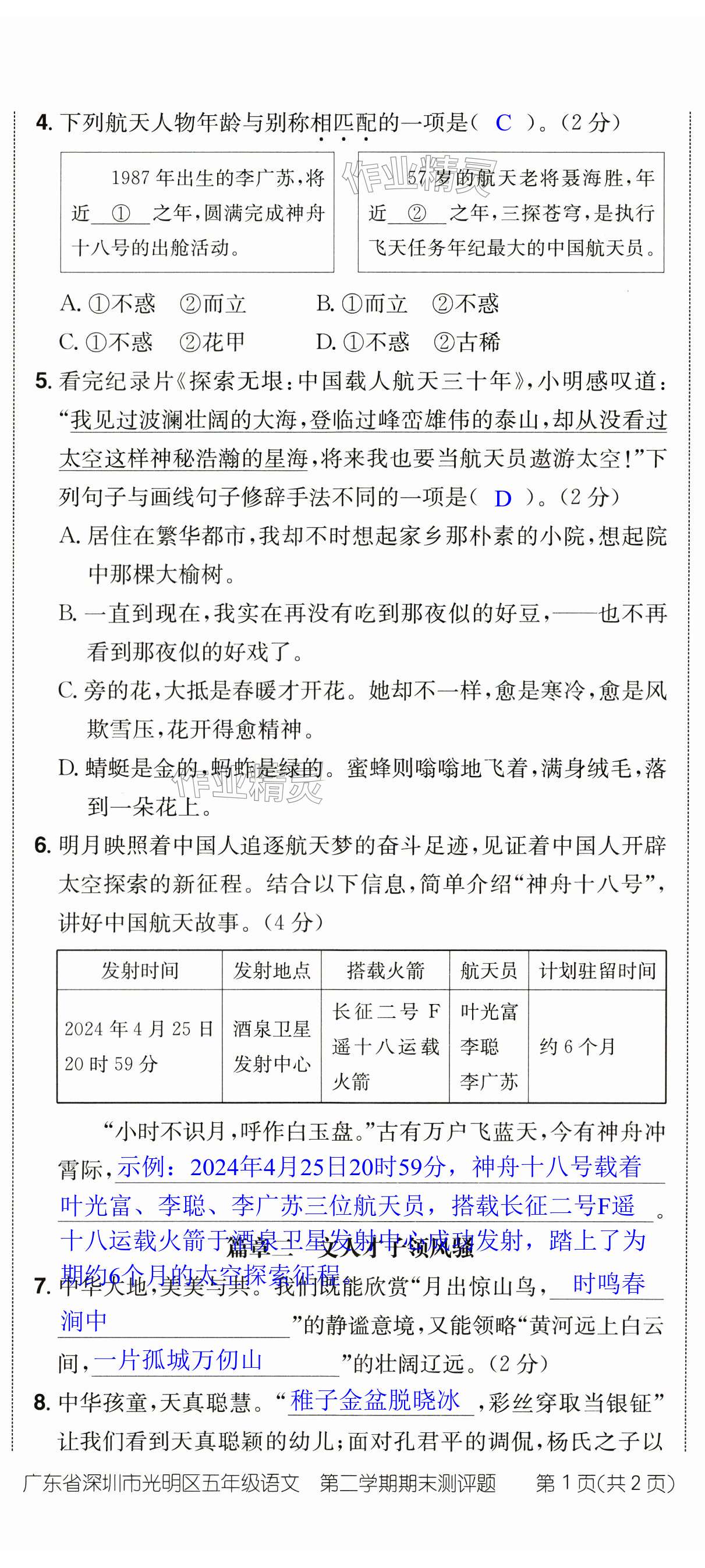 注:目前有些书本章节名称可能整理的还不是很完善,但都是按照顺序排列的,请同学们按照顺序仔细查找。练习册 2025年黄冈小状元作业本五年级语文下册人教版广东专版 答案主要是用来给同学们做完题方便对答案用的,请勿直接抄袭。