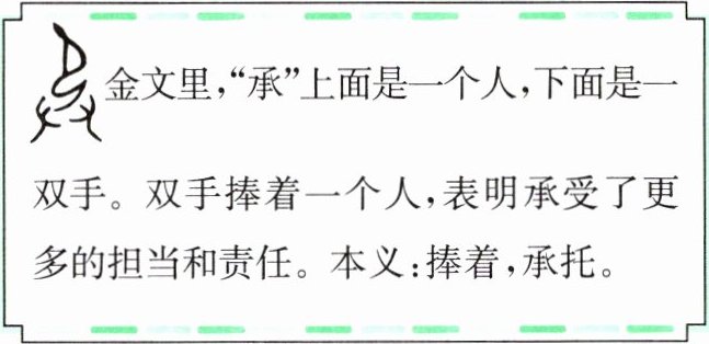 金文里,“承”上面是一个人,下面是一双手。双手捧着一个人,表明承受了更多的担当和责任。本义:捧着,承托。