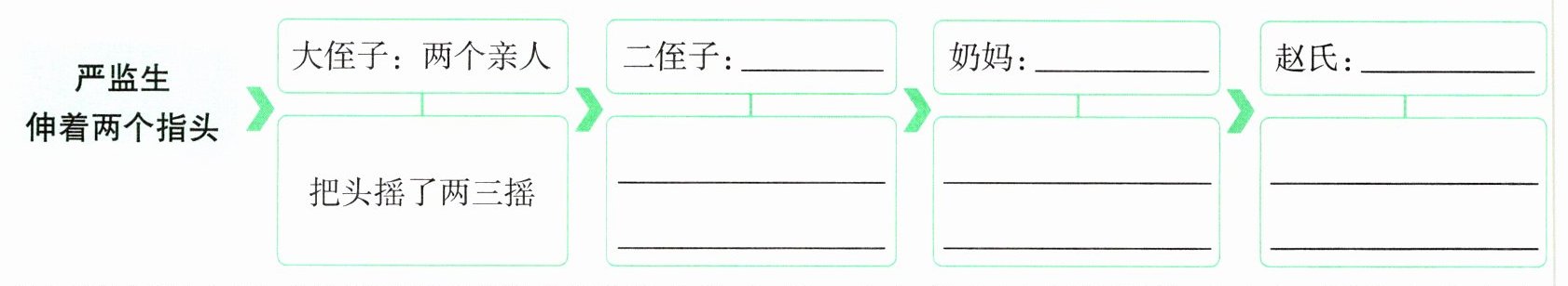 1. 思维题 同学们准备把《两茎灯草》改编成课本剧,请你细读旁人的猜测与严监生的动作、神态,提取关键词句,填一填。
