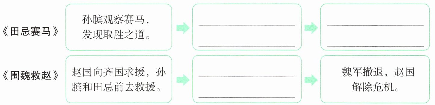 田忌改变马的出场顺序。@@田忌赢了齐威王。@@田忌和孙膑带领齐军向大梁进军。@@孙膑@@在这两个故事中,孙膑都凭借自己的智慧取得了胜利@@C@@齐威王@@齐威王虽然输掉了赛马,但他赢得了孙膑这位军师。孙膑为齐威王出谋划策,使他打赢了很多胜仗。