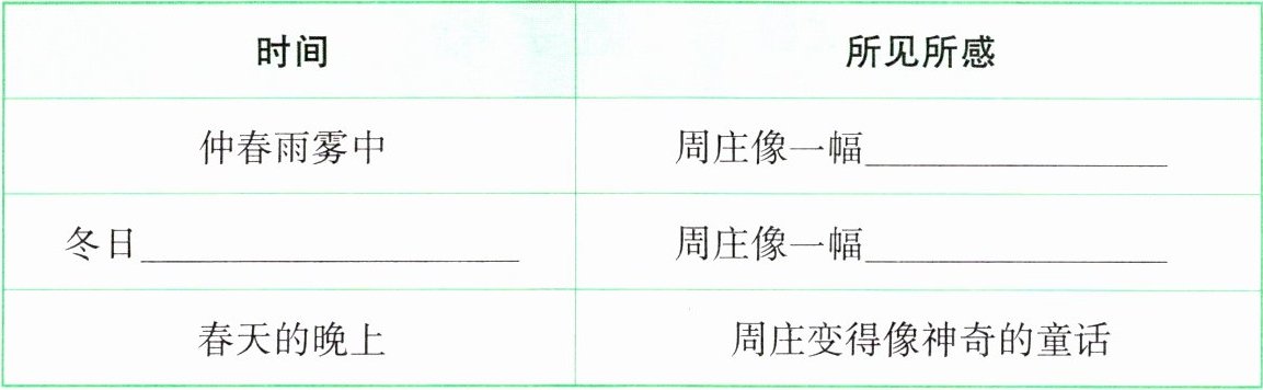 3. 作者每次游周庄的所见所感都不同,请根据提示完成表格。