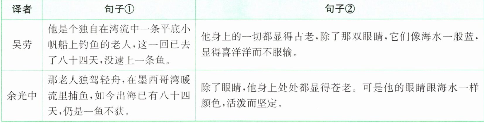 3. 下面是不同译者笔下《老人与海》中的句子,你更喜欢________的译文,理由是______________________________。