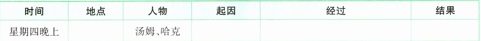 1. 补全六要素,并用“六要素串联法”概括汤姆和哈克这次的冒险经历,拟写梗概(不超过80字)。