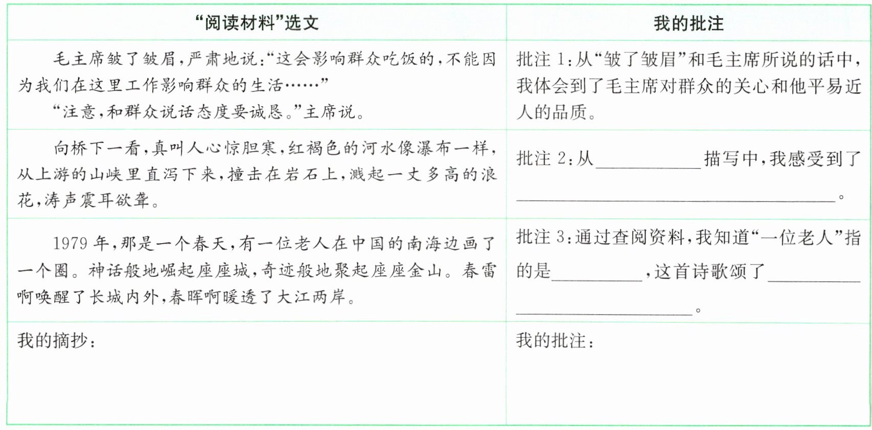 3. 请根据自己的阅读经验,摘抄课本“阅读材料”中的语句,并写写你的批注。