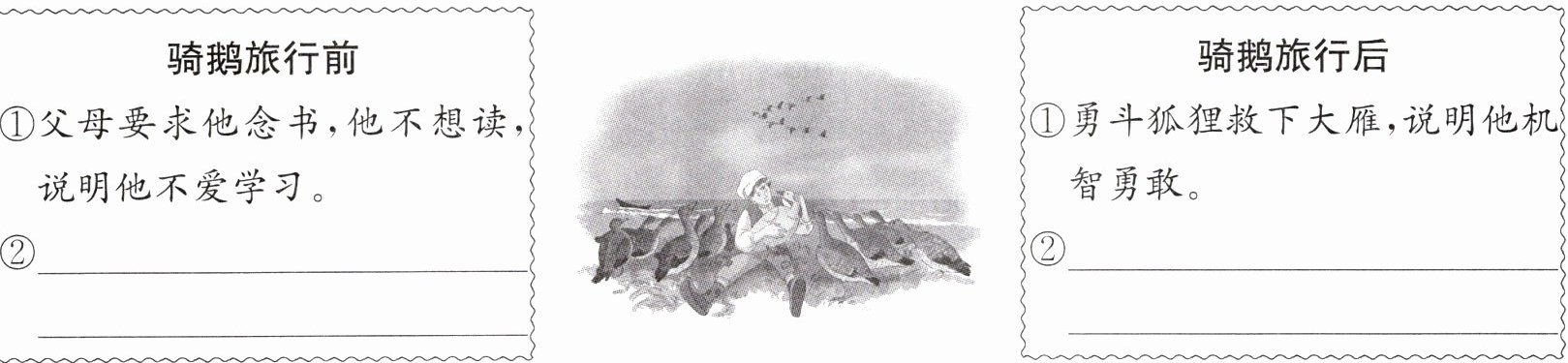 (示例)骑鹅旅行前:②虐待家里的小动物,说明他调皮捣蛋。骑鹅旅行后:②为了救雄鹅放弃变回人的机会,说明他善良、有责任心。