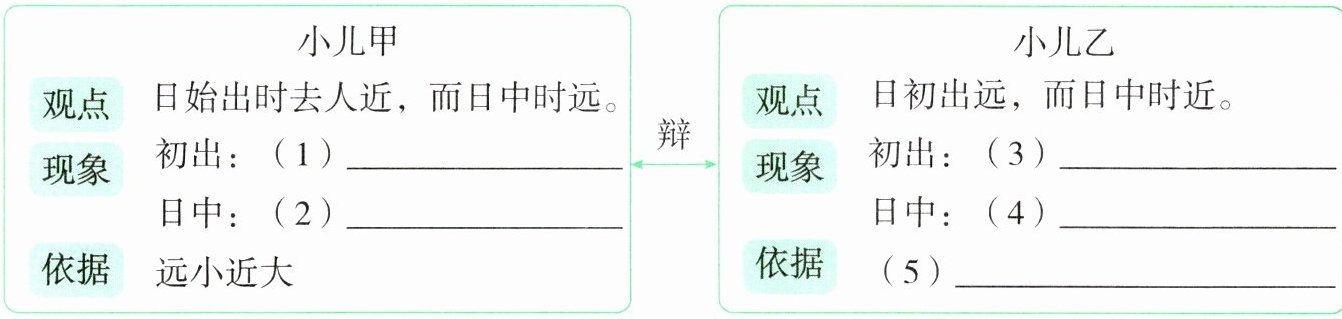 3. 梳理选段中两小儿辩斗的观点、现象和依据,把导图补充完整。