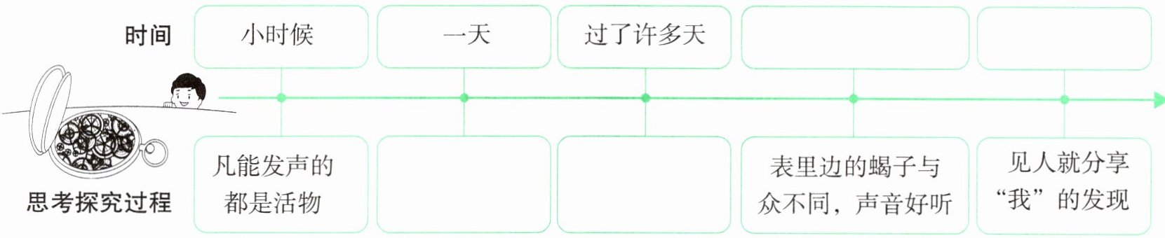 解析:此题考查把握课文主要内容的能力。完成此题,先在课文中勾画出表示时间的词语,如“小时候”“一天”“过了许多天”“此后”“后来”,再联系课题,想想课文围绕“表里的生物”,在这些时间点上都发生了什么,梳理并概括出来即可。