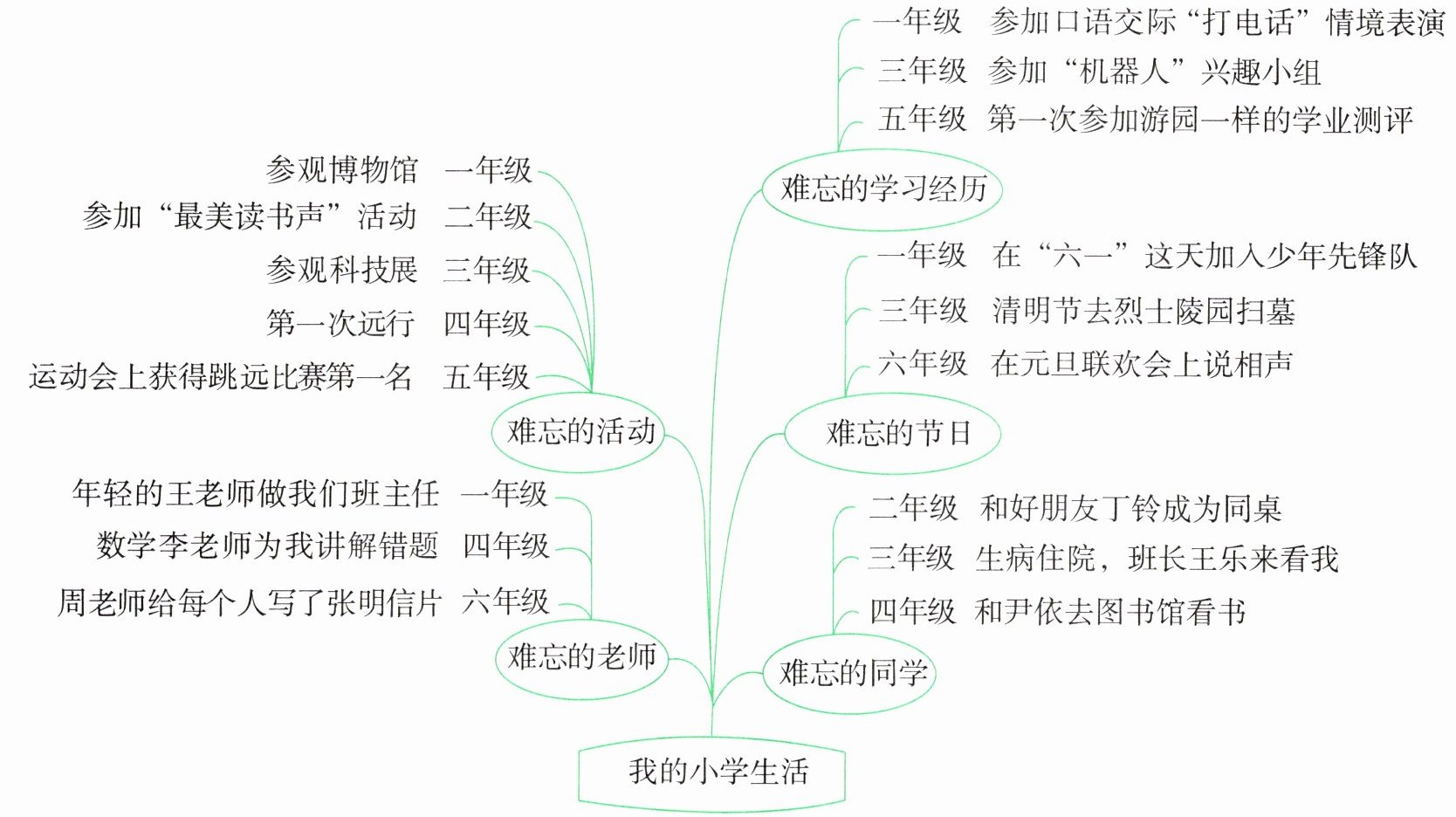 一、在学习活动中,龙一鸣回忆了六年小学生活的点点滴滴,整理绘制了“我的小学生活”树状时间线索图,请认真阅读,完成练习。
