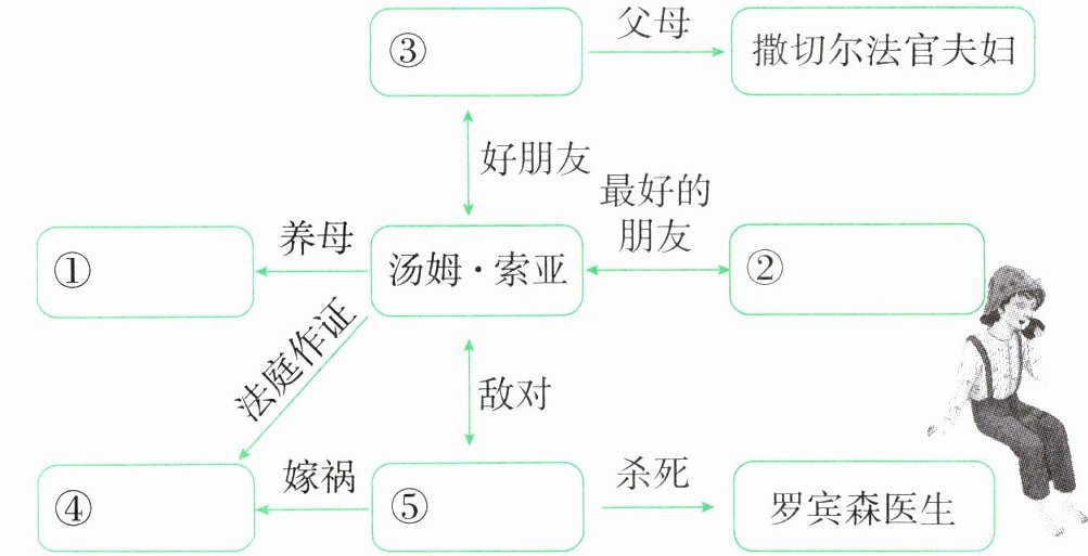 1.下面是霏霏阅读《汤姆.索亚历险记》后绘制的人物 2.阅读完《汤姆.索亚历险记》后,同学关系图,请你补充完整。 们进行了阅读分享。请你填写读书记录卡,将你的阅读收获分享给大家。