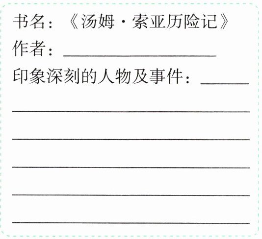 1. ①波莉姨妈 ②哈克 ③贝琪 ④穆夫·波特 ⑤印江·乔埃 2. 作者:马克·吐温 印象深刻的人物及事件:汤姆·索亚是一个既聪明又调皮捣蛋的孩子,姨妈罚他刷栅栏,他却假装刷栅栏是件很好玩儿的事儿,让其他孩子抢着为他刷栅栏。汤姆骨子里具有冒险精神,他会约上小伙伴一起去做海盗。汤姆勇敢且又充满正义感,他指认杀人犯印江·乔埃,最终让坏人得到惩罚。