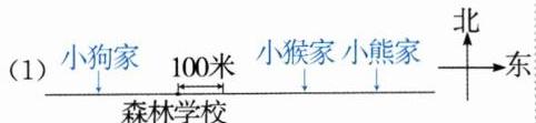 (1)标注时要注意,首先确定东、西方向,以森林学校为中心,小猴家在森林学校右边280米处,小狗家在森林学校左边180米处,小熊家是以小猴家为中心,在小猴家右边162米处,根据方向和距离可以分别标出小动物家的大致位置。