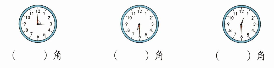 2. 广东真题 用三角板比一比,下面各钟面上的时针和分针成什么角?