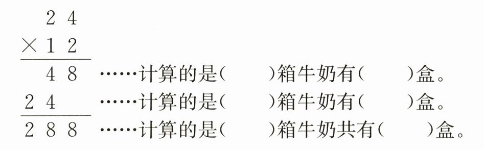 解析:在乘法竖式计算中,24×2 = 48,这里的2表示2箱,所以48表示2箱牛奶有48盒;24×10 = 240,这里的10表示10箱,所以240表示10箱牛奶有240盒;最后把两部分相加,240 + 48 = 288,表示12箱牛奶共有288盒。