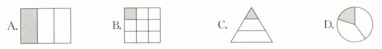 1. 下列各图的涂色部分,能用$\frac{1}{3}$表示的是( )。