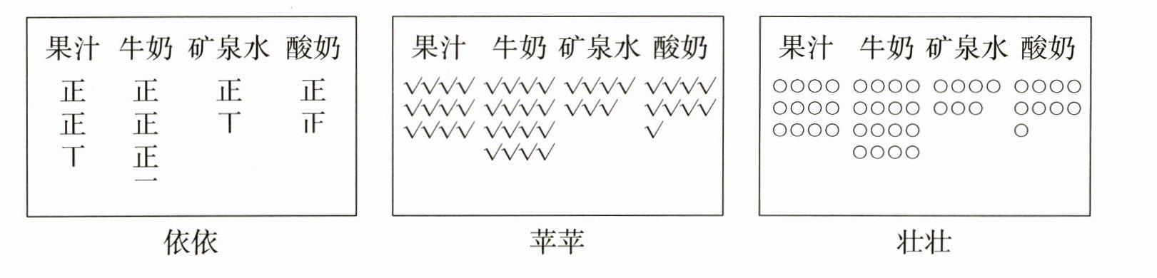 1. 下面是三位同学对三(2)班同学最喜欢的饮品的调查记录。(每人限选一种)