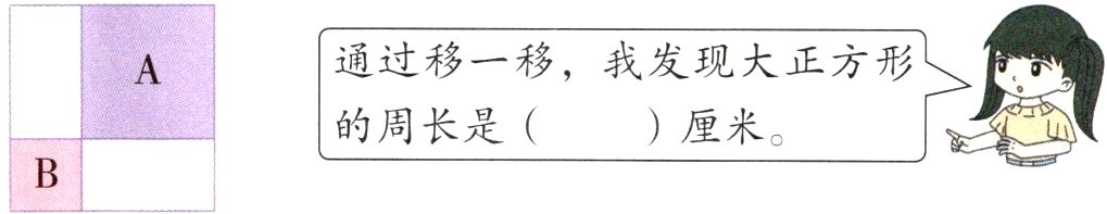 ,将正方形 A 和正方形 B 的两条边平移后,发现 A,B 两个正方形的周长之和就是大正方形的周长,所以大正方形的边长为 96÷4 = 24(厘米),面积是 24×24 = 576(平方厘米)。