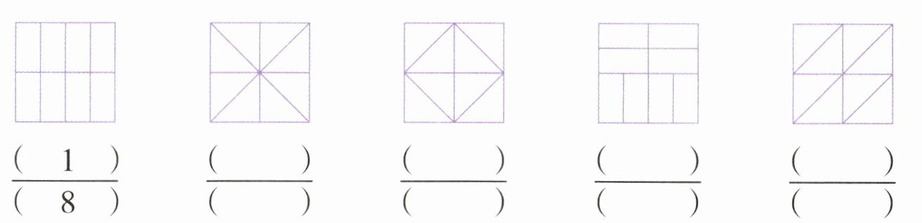 2. 如图,把一张正方形纸平均分成 8 份,先分别涂出其中的 1 份、3 份、5 份、7 份和 8 份,再照样子填一填。