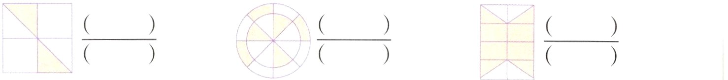 时,可以看出,把圆平均分成8份,涂色部分是3份,所以涂色部分占整个图形的$\frac{3}{8}$。第三幅图,将上面左边涂色的三角形平移到下面右边空白三角形处,上面右边涂色三角形平移到下面左边空白三角形处,正好填满最下面的小长方形。不难看出,把大长方形平均分成8份,涂色部分是6份,所以涂色部分占整个图形的$\frac{6}{8}$。也可以把每个小长方形平均分成2份,