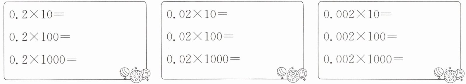 解析:此题考查乘法算式的运算规律,通过对比每组算式的结果来总结规律。每组算式中都有一个相同的乘数,另一个乘数乘10,100或1000,可以发现每组算式中的积也随着乘10,100或1000。
