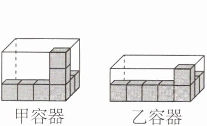 解析:本题考查比较两个长方体容器容积大小的方法。根据容器棱长上小正方体的个数,可以求出甲容器和乙容器分别能装小正方体的总个数,因为每个小正方体的体积相同,装的小正方体的个数越多,容器的容积就越大。甲容器每层可以摆12个小正方体,可以摆3层,一共可以装下36个小正方体,同样,可以计算出乙容器可以装下30个小正方体,再进行比较,可以得出甲容器的容积大。