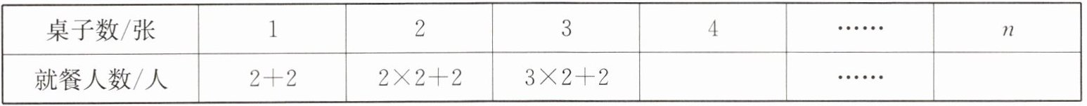 (1) 观察图发现,一张桌子每边坐1人,不管几张桌子,桌子左右各坐1人不变。第一张桌子上下各坐1人,每增加一张桌子,上下各增加1人,也就是共增加2人就餐。4张桌子,上下各4人,左右各1人,共有$(4×2 + 2)$人。用$n$表示桌子张数,桌子上下各$n$人,左右各1人,因此共有$(n×2 + 2)$人。