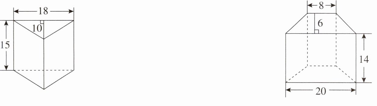 (2)左图:底面是三角形,面积是18×10÷2 = 90(cm²),高是15cm,所以体积V = Sh = 90×15 = 1350(cm³);右图:底面是梯形,面积是(8 + 20)×6÷2 = 84(cm²),高是14cm,所以体积V = Sh = 84×14 = 1176(cm³)。