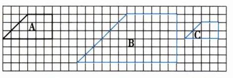解析:本题考查放大和缩小的相关知识。面积之比为4 : 1,则图形各边对应比为2 : 1,即将图形按2 : 1放大。根据梯形上底、下底和高在图中的方格数,先求出放大后的梯形上底、下底和高的方格数,再画出符合题目要求的图形B,用相同的方法可以画出缩小后的图形C。