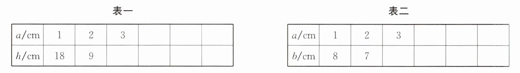 (4)表一中,$a$和$h$成( )比例;表二中,$a$和$b$( )比例。