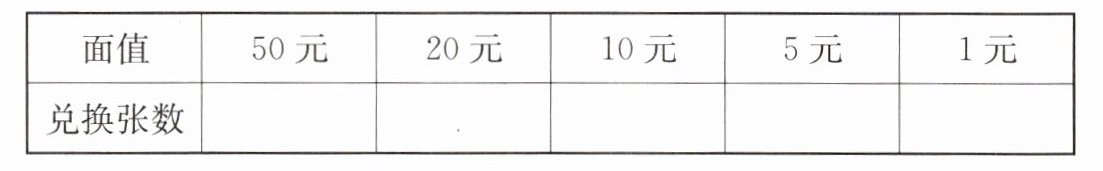 2. 依依学习“认识人民币”时,将100元人民币兑换成下表中同一种小面值的人民币。