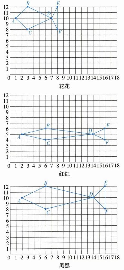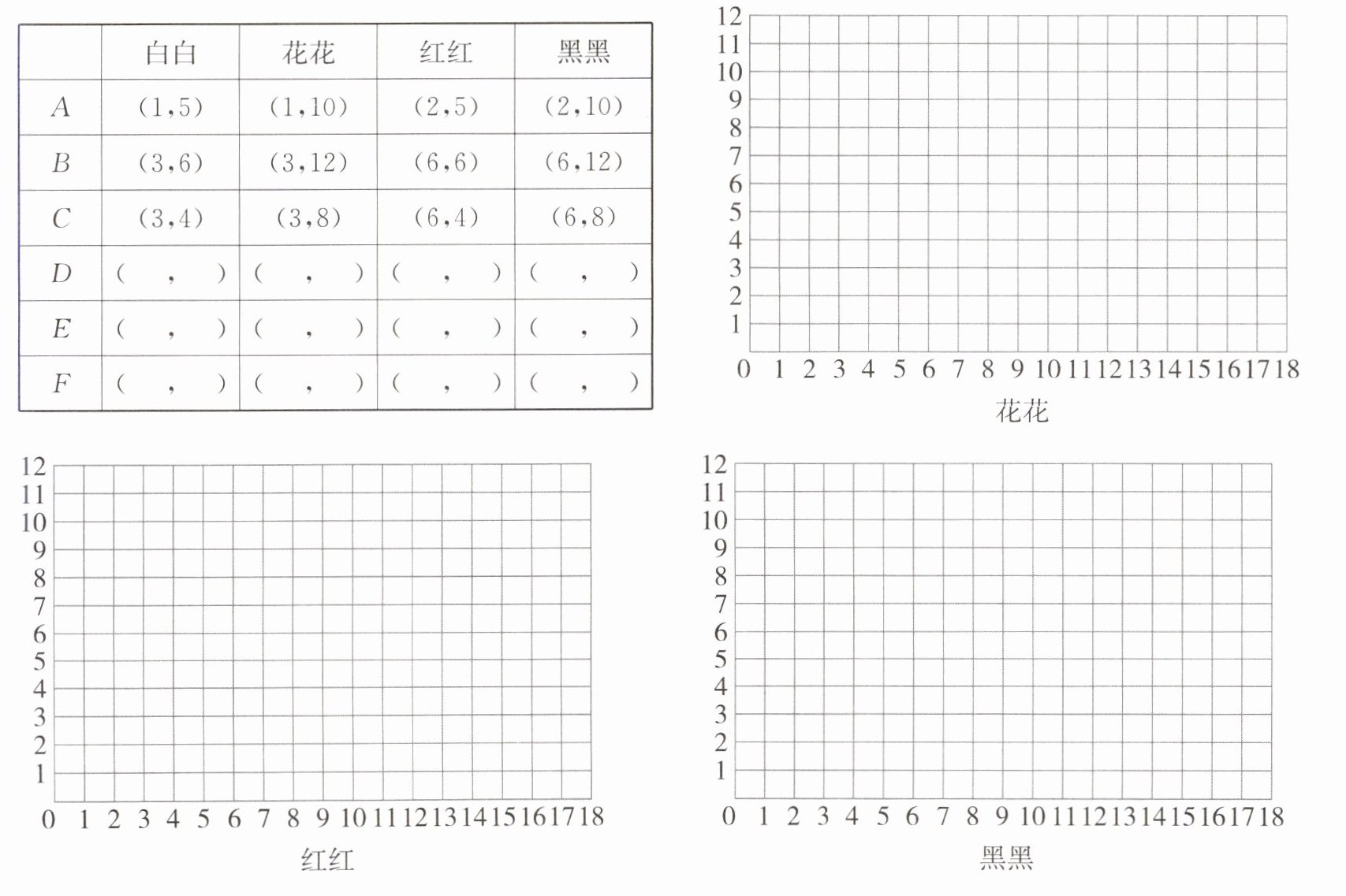 (3)小金鱼白白还有三个小伙伴花花、红红和黑黑。根据下表中小金鱼轮廓的点的数对规律,把表格填完整,并在方格图中分别画出三条小金鱼的轮廓。