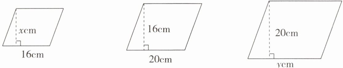 5. 下图是将中间的平行四边形分别按比缩小和放大后得到的左、右两个平行四边形,请分别求出$x$和$y$。