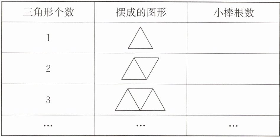 (1)从表中图形可以看出,摆1个三角形需要3根小棒,摆2个三角形在1个三角形的基础上增加了2根小棒,一共需要$(3 + 2)$根小棒,摆3个三角形在2个三角形的基础上又增加了2根小棒,一共需要$(3 + 2 + 2)$根小棒……根据这个规律,如果用$n$表示三角形个数,那么摆出$n$个三角形需要用的小棒根数为$(2n + 1)$根。