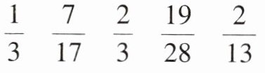 $\frac{5}{4}\times\frac{4}{15}=$ $\frac{6}{17}\times\frac{7}{6}=$ $\frac{16}{9}\times\frac{3}{8}=$ $\frac{2}{7}\times\frac{19}{8}=$ $\frac{3}{13}\times\frac{2}{3}=$