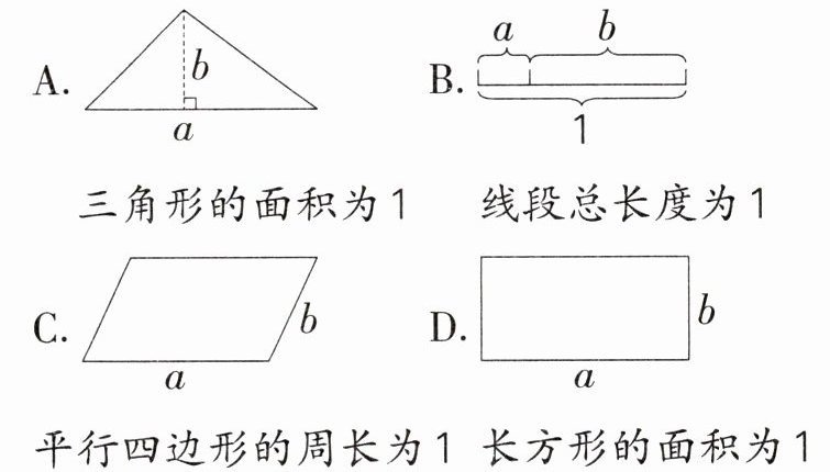 (4)(名校期末真题)下面四幅图中的$a$和$b$表示不同的数,则图( )中的$a$和$b$互为倒数。