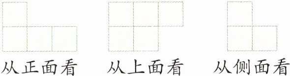 6. 用几个体积是1 cm³的小正方体搭成一个立体图形,从正面、上面和侧面看到的形状如下图,计算这个立体图形的体积。
