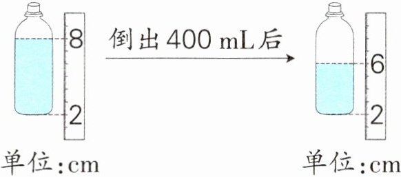 $400\div(8 - 6)\times(8 - 2)=1200(mL)$答:原来瓶子里的果汁大约是1200 mL。解析:观察图,原来瓶子里的果汁从刻度2到刻度8,倒出400 mL果汁后,瓶子里的果汁从刻度2到刻度6,降低了8 - 6 = 2(cm),先求出每厘米果汁为400÷2 = 200(mL),原来瓶子里的果汁有8 - 2 = 6(cm),所以有200×6 = 1200(mL)。