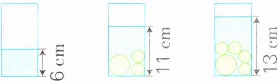 5. 一个长方体容器,从里面量长8 cm、宽5 cm,原来水高是6 cm。在容器中放入若干个大球和小球,根据水位变化图,计算出大球的体积是( )$cm^{3}$,小球的体积是( )$cm^{3}$。