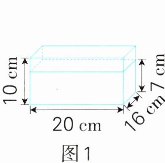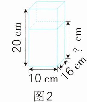2. 有一个完全封闭的长方体容器,从里面量长$20\ cm$、宽$16\ cm$、高$10\ cm$。平放时容器内水面高$7\ cm$(如图1所示)。如果把这个容器竖起来放(如图2所示),水的高度是多少厘米?
